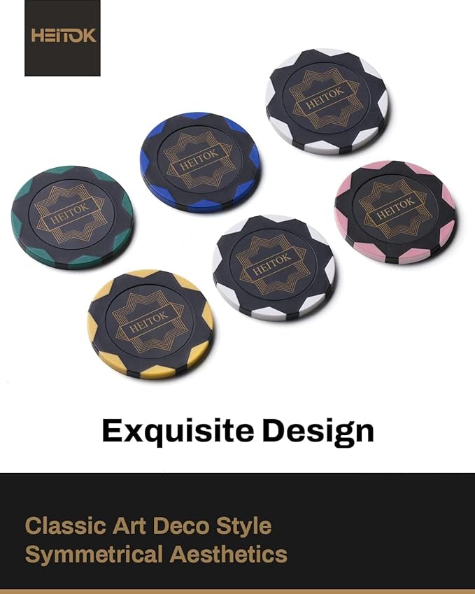Elevate your next game night with a set built for performance and style! Our 500 clay poker chips are forged with an iron core and composite material to achieve a satisfying 14-gram weight and superior feel. The design merges 1920s Art Deco grandeur with modern simplicity, delivering an exquisite look that stands out.