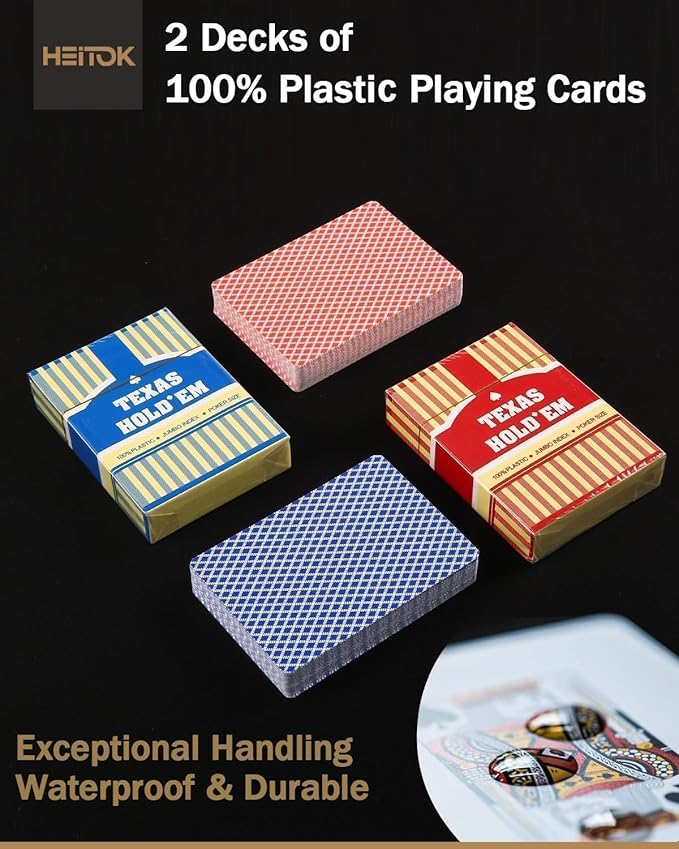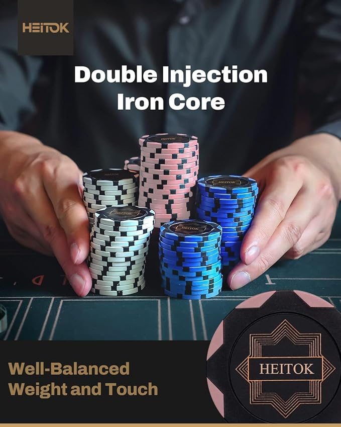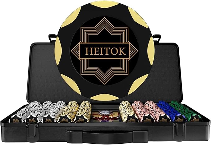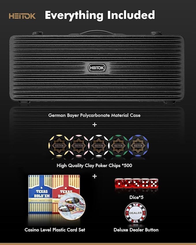 Complete Game Ready: The 500-piece set is perfectly proportioned for 9-10 players and includes everything required for immediate play: 2 decks of premium HEITOK plastic playing cards, 5 dice, and a dealer button.
