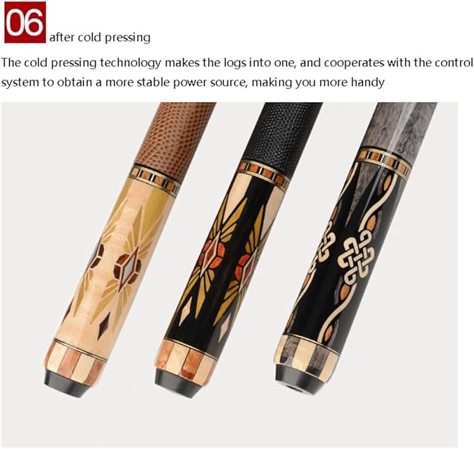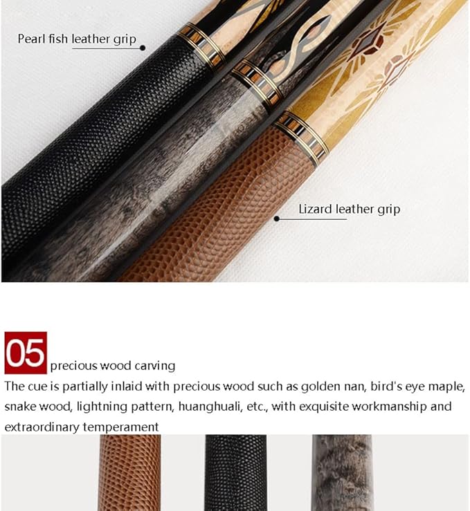 Comfort and Elegance: The grip offers two distinct luxurious options: a comfortable pearl fish pattern leather or a smooth, royal-style pattern leather. Both ensure a light handle for powerful control. The cue’s extraordinary temperament is highlighted by exquisite craftsmanship, featuring precious wood inlays such as golden nan, snake wood, and huanghuali.