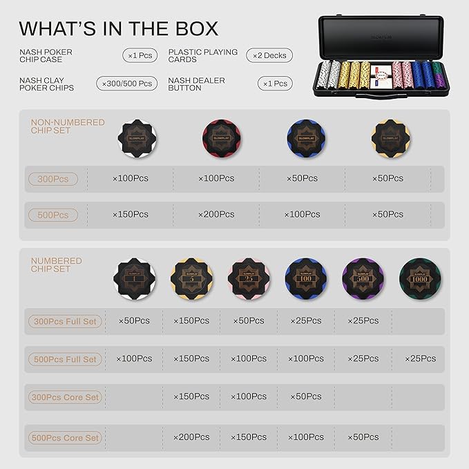SLOWPLAY Nash 14g Clay Poker Chip Set – 500PCS Full Set for Texas Hold’em | Numbered Chips: 1, 5, 25, 100, 500, 1000 | Premium Case with Durable German Polycarbonate Shell
