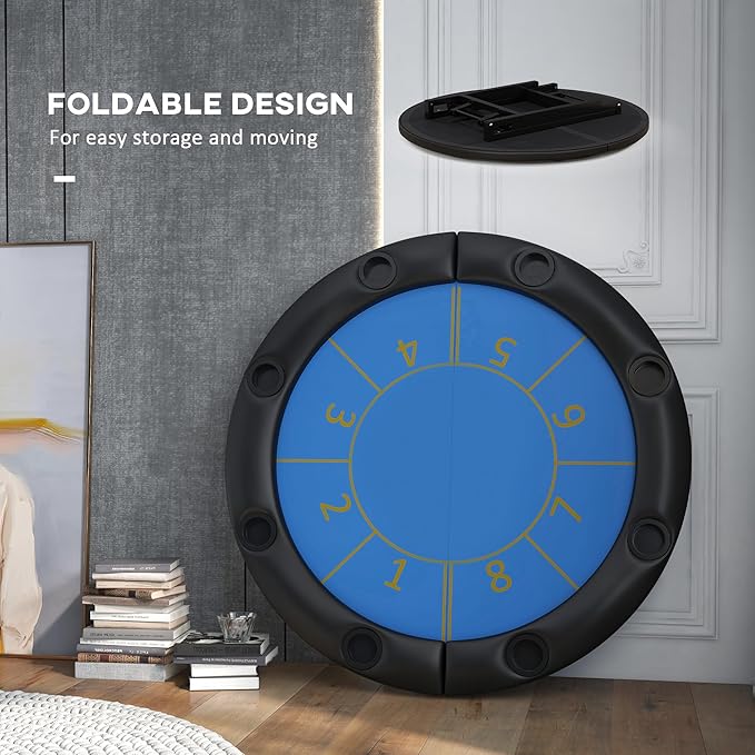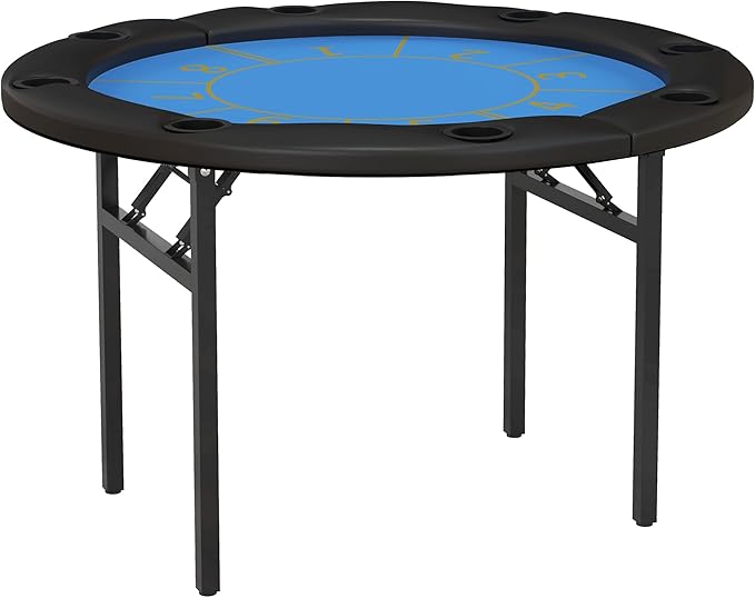 Soozier Poker Table Foldable, 47″ Round Blackjack Casino Texas Holdem Poker Game Table for 8 Players with Cup Holders, Blue and Black