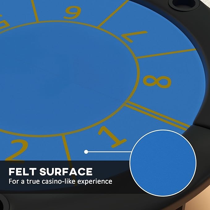 This folding poker table delivers a professional experience without sacrificing convenience. Designed for eight players, it provides a comfortable setting for all your favorite card games, from Texas Hold’em to Blackjack. The classic felt surface features a professional layout and designated card placement areas, ensuring an authentic feel.